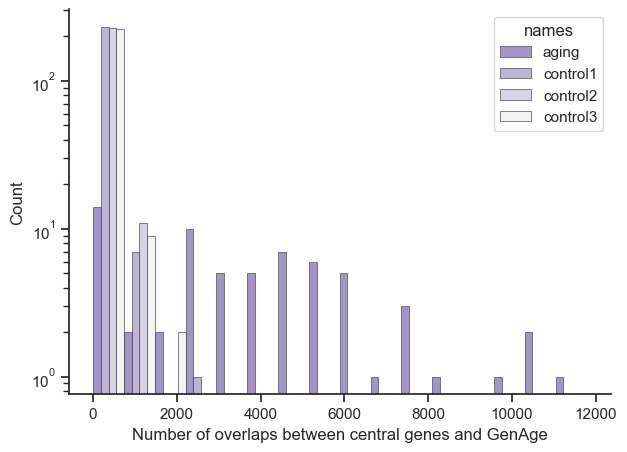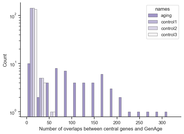 Overall, this is an exceptional result, central genes from the global aging genes are enriched/overlapped on average 10 times over the control sets.