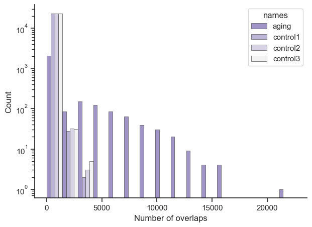 Just so it’s clearer, let’s say you had a result of {‘ENSG1’: 10, ‘ENSG2’: 10, ‘ENSG3’: 50}. The X axis would show a bar at number of overlaps 10 with a count of 2, and another bar at number of overlaps 50 with count 1. Also the bars position is roughly accurate, due to putting multiple bars for aging, control1, control2, and control3 next to each other.