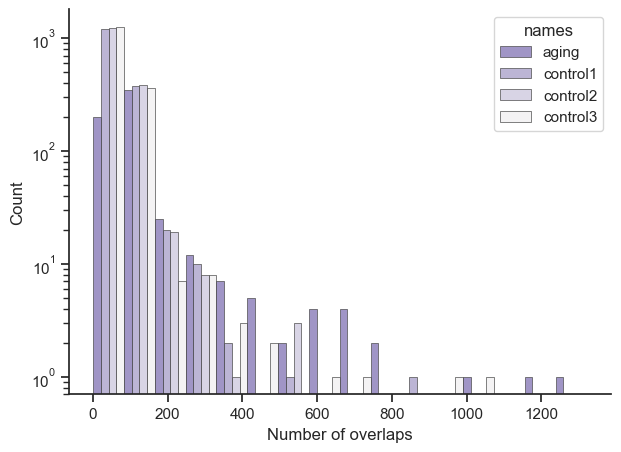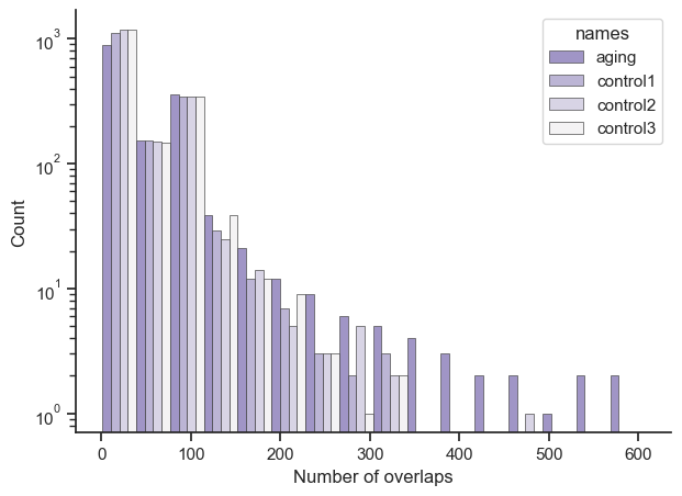 Just so it’s clearer, let’s say you had a result of {‘ENSG1’: 10, ‘ENSG2’: 10, ‘ENSG3’: 50}. The X axis would show a bar at number of overlaps 10 with a count of 2, and another bar at number of overlaps 50 with count 1. Also the bars position is roughly accurate, due to putting multiple bars for aging, control1, control2, and control3 next to each other; so aging’s largest value is 606, it’s just that the bar is shoved to the left by the other bars.