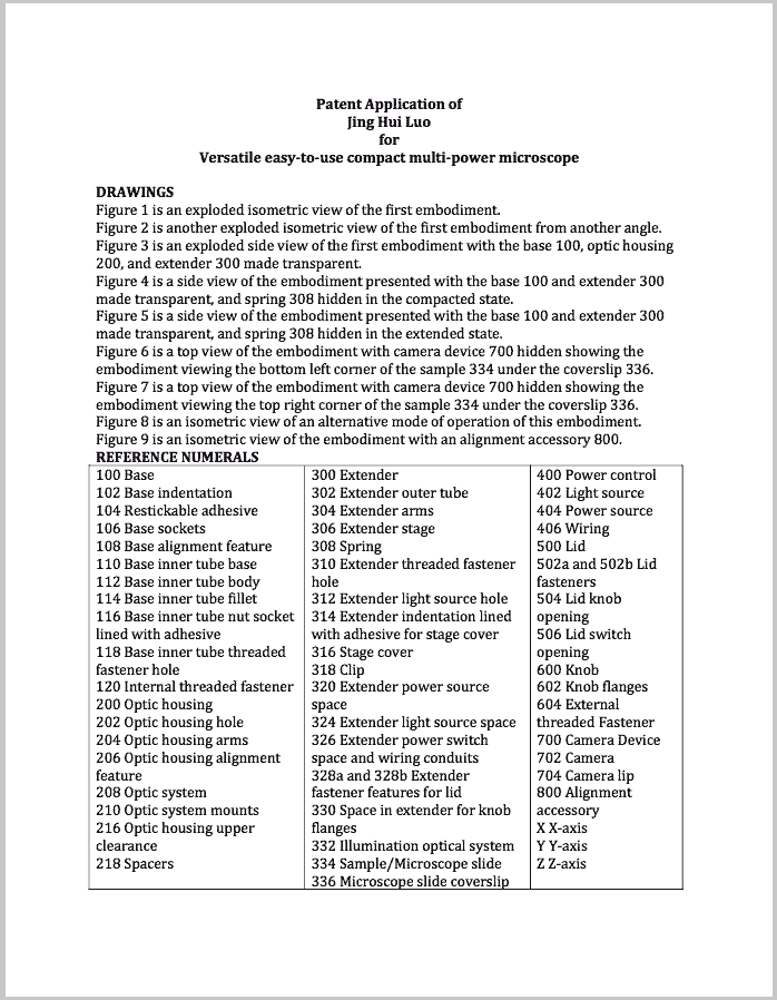 Luckily, the filling fee for a micro-entity is cheap like $100, but that's not where it gets expensive. It's A lot of work to write patent! Step one read this 650 page book on how to write a patent (http://a.co/gnhAKHJ). Honestly this part was pretty interesting. I never knew how the patent system worked, but now I have a general understanding. The main intellectual property types are utility patents, design patents, copyright, trademark, and trade secret. Utility patent is the one relevant for this microscope, and the patentability of a invention is determined by whether it's a patentable subject matter meaning the patent office covers it, novel so it's new, useful is some way, and non-obvious. Non-obvious is where it gets really difficult to determine, since it's basically asking could the average person in the industry have figured this out? If you're invention fails one of these requirements, it's not patentable and you've wasted a lot of time/money. For this microscope, I felt I had met all the criteria, since it falls under the patent office, useful, and involves very novel functional design elements that I haven't seen elsewhere so novel enough to be non-obvious which isn't the best but eh we'll give it a shot :)