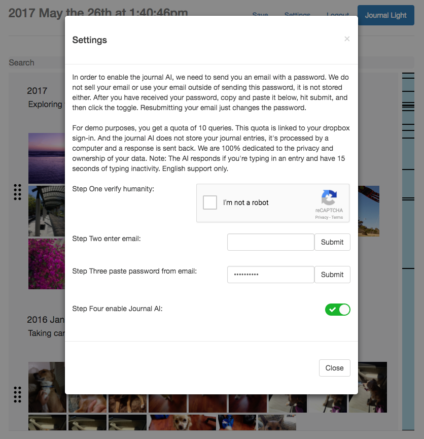 So basically I have users submit their email, so that I can send a unique password to them, which they enter into the Settings page to enable the journal AI.
